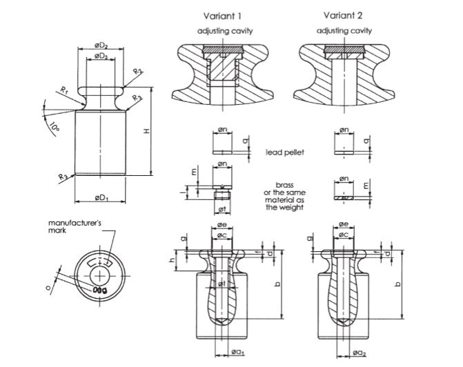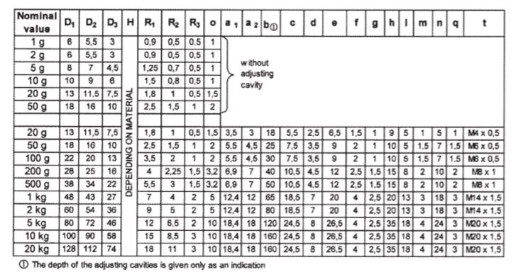 Knob type cylindrical type 50kg to 20g have an adjusting cavity. 10g to 1g are solid. |